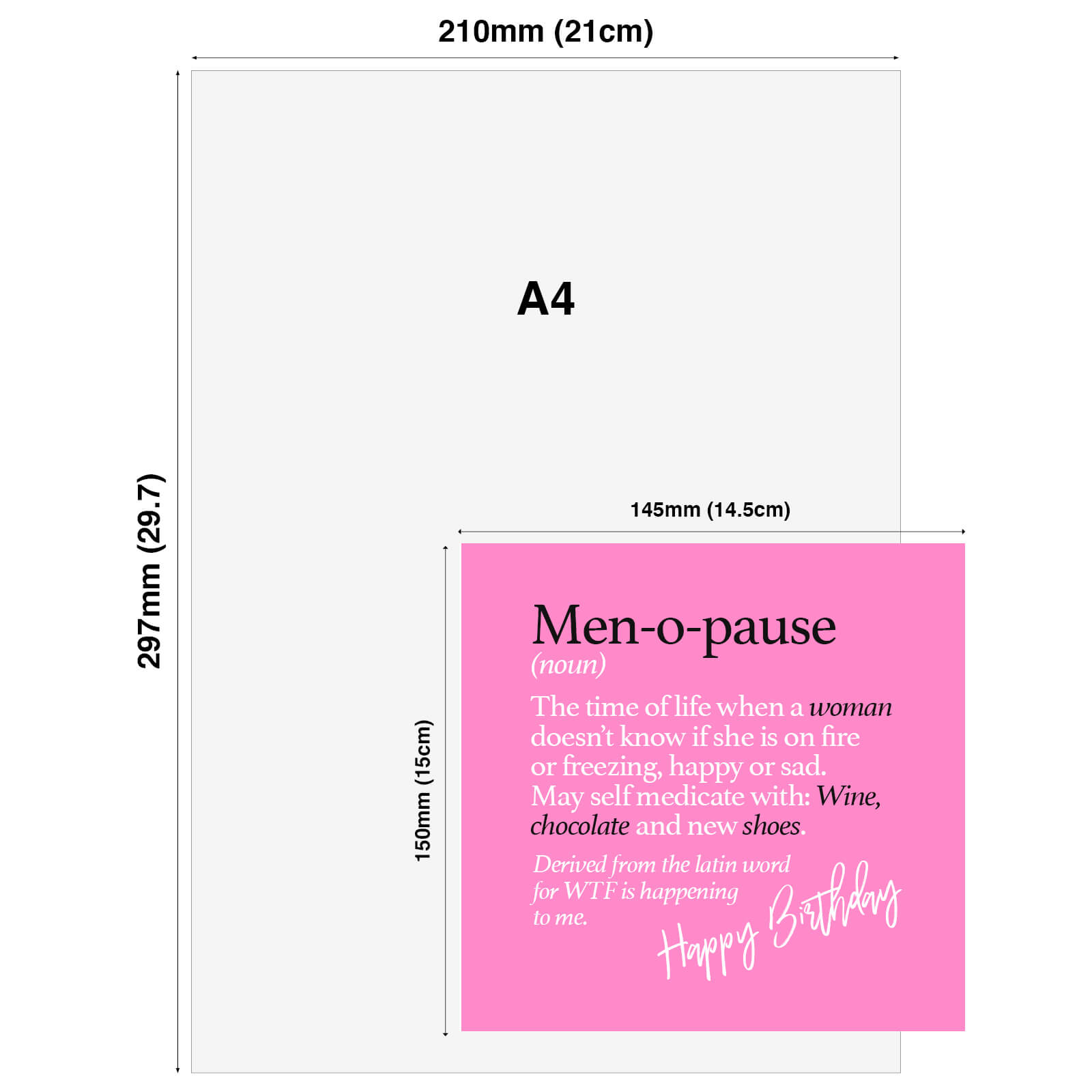 Men-o-pause (noun) The time of life when a woman doesn’t know if she is on fire or freezing, happy or sad. May self medicate with: Wine, chocolate and new shoes. Derived from the latin word for WTF is happening to me.