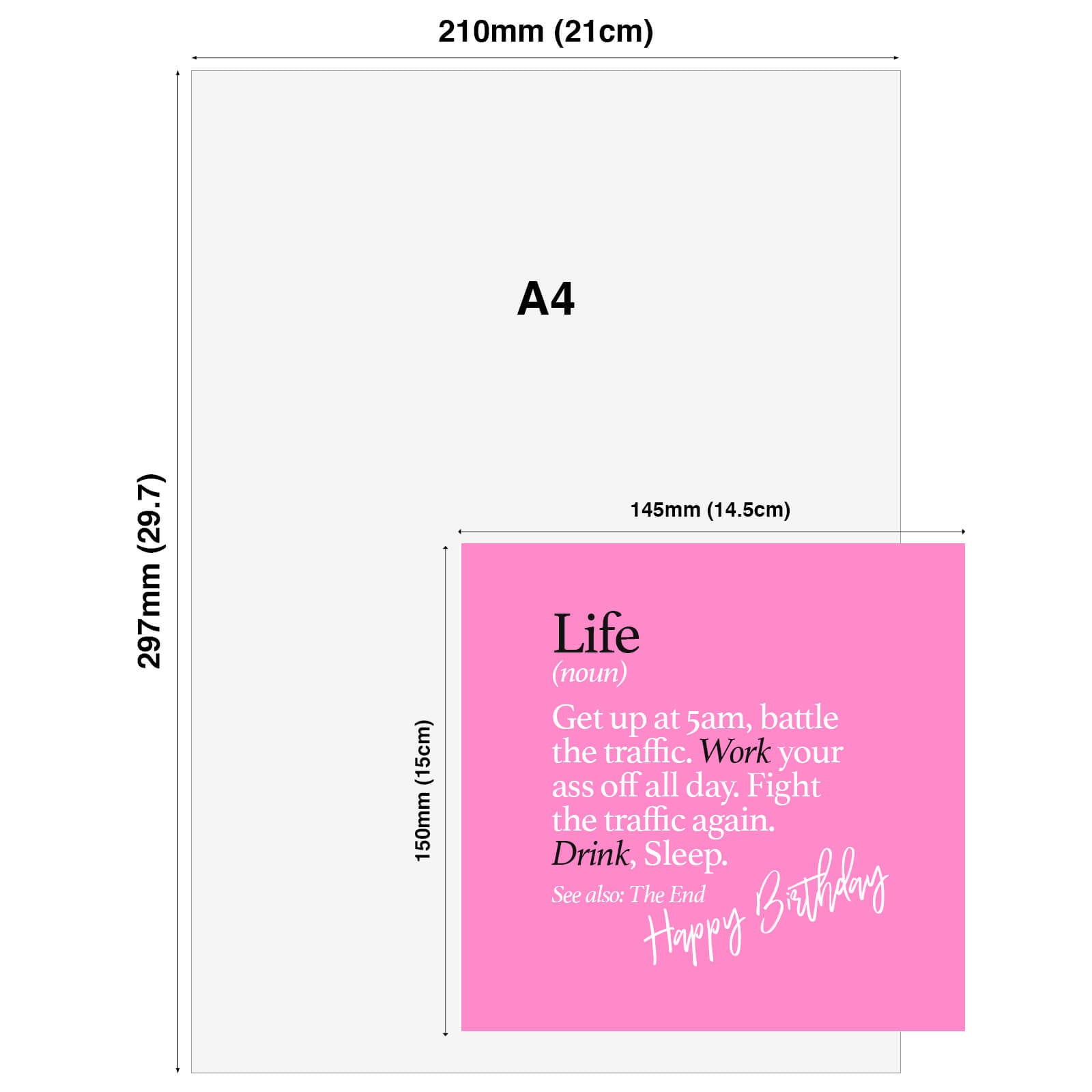 Life (noun) Get up at 5am, battle the traffic. Work your ass off all day. Fight the traffic again. Drink, Sleep. See also: The End