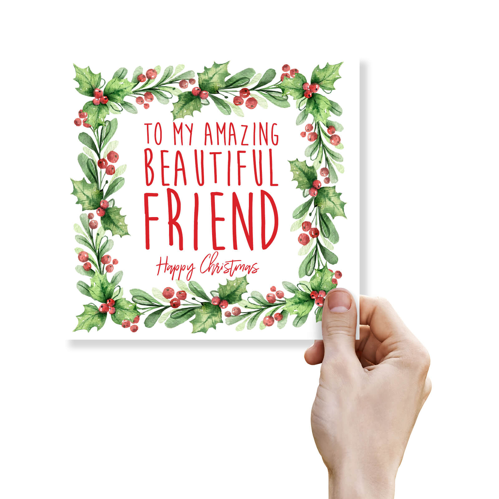 For that special friend who brings sparkle and laughter all year long. With a festive holly border and the heartfelt words *“To My Amazing Beautiful Friend – Happy Christmas”*, this card is the perfect way to show how much you appreciate them.