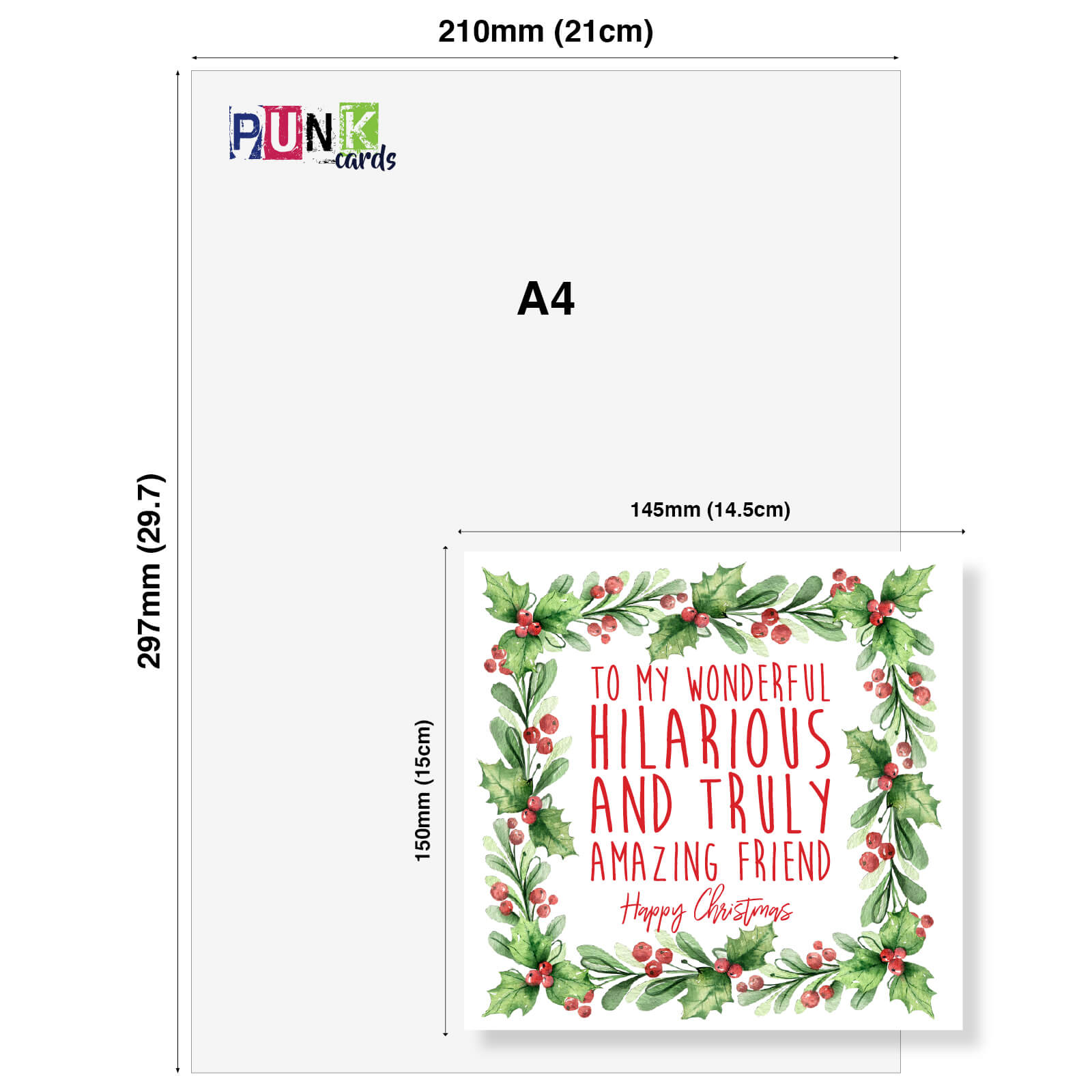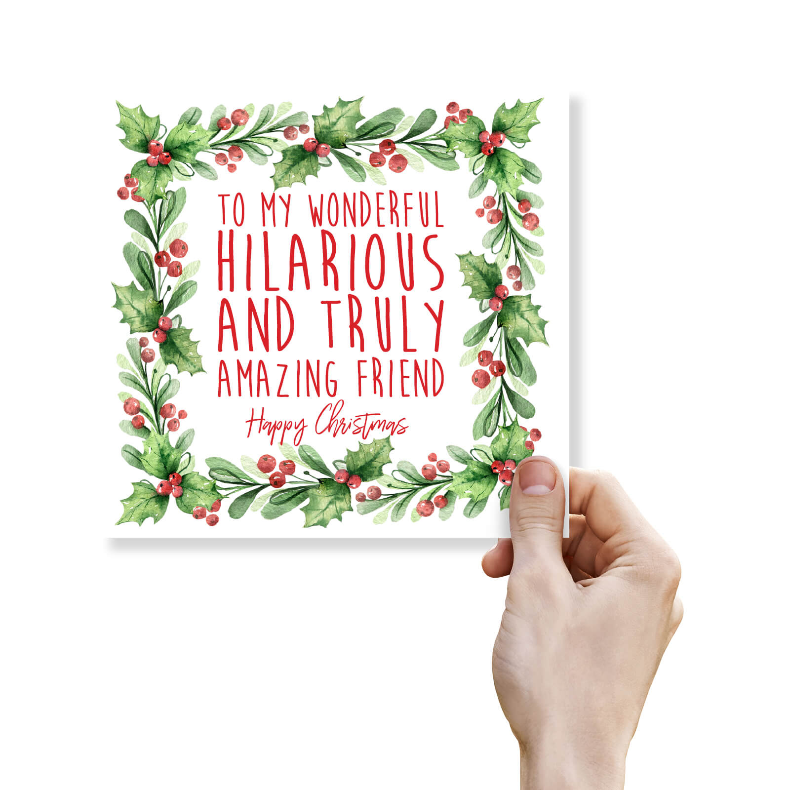 For the friend who makes you laugh till you cry, this card delivers all the festive feels. The joyful wording *“To My Wonderful, Hilarious and Truly Amazing Friend – Happy Christmas”* is wrapped in seasonal holly, perfect for the life of your social circle.