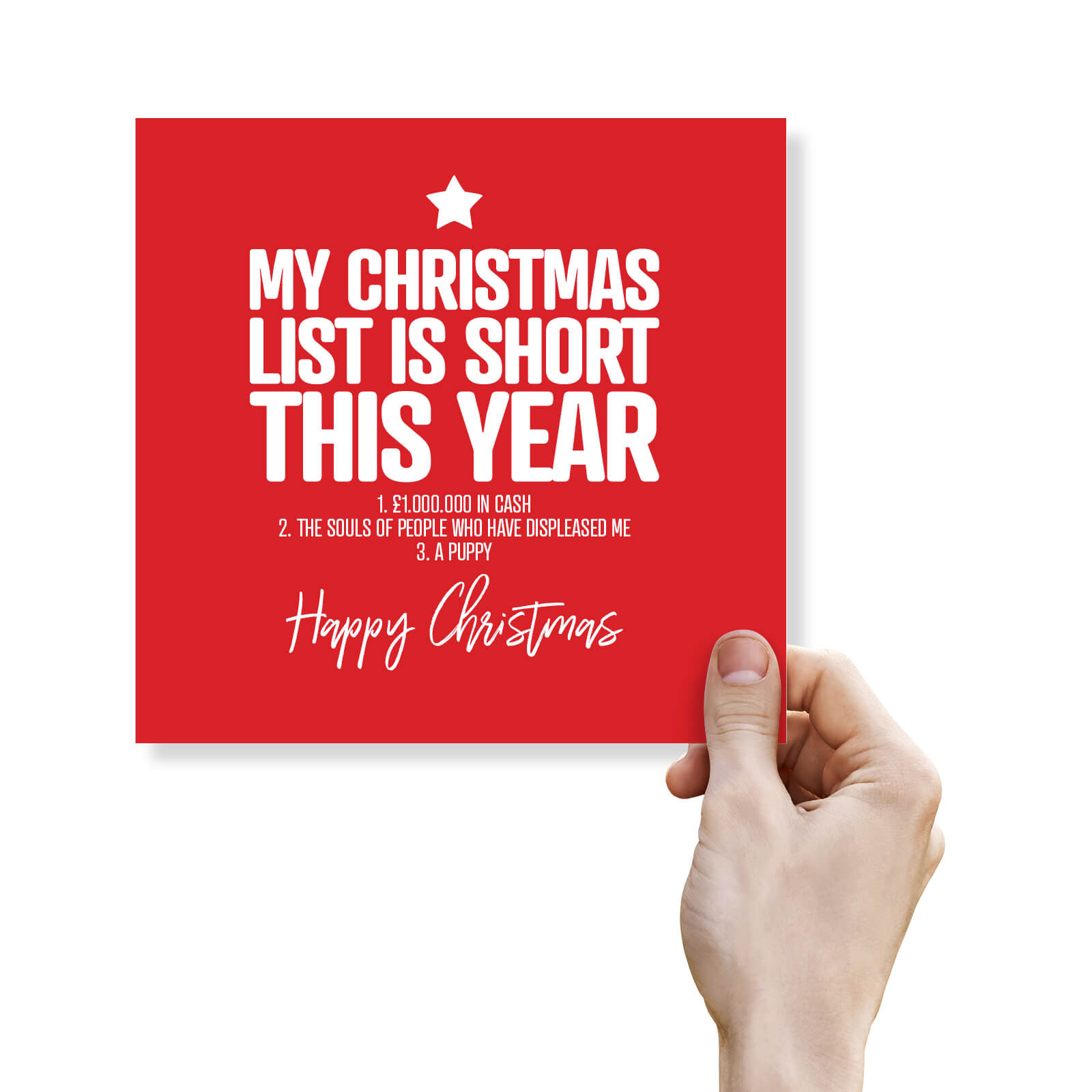 A hilariously dramatic Christmas wish list for the mischievous gift-giver. Equal parts cheeky and over-the-top.