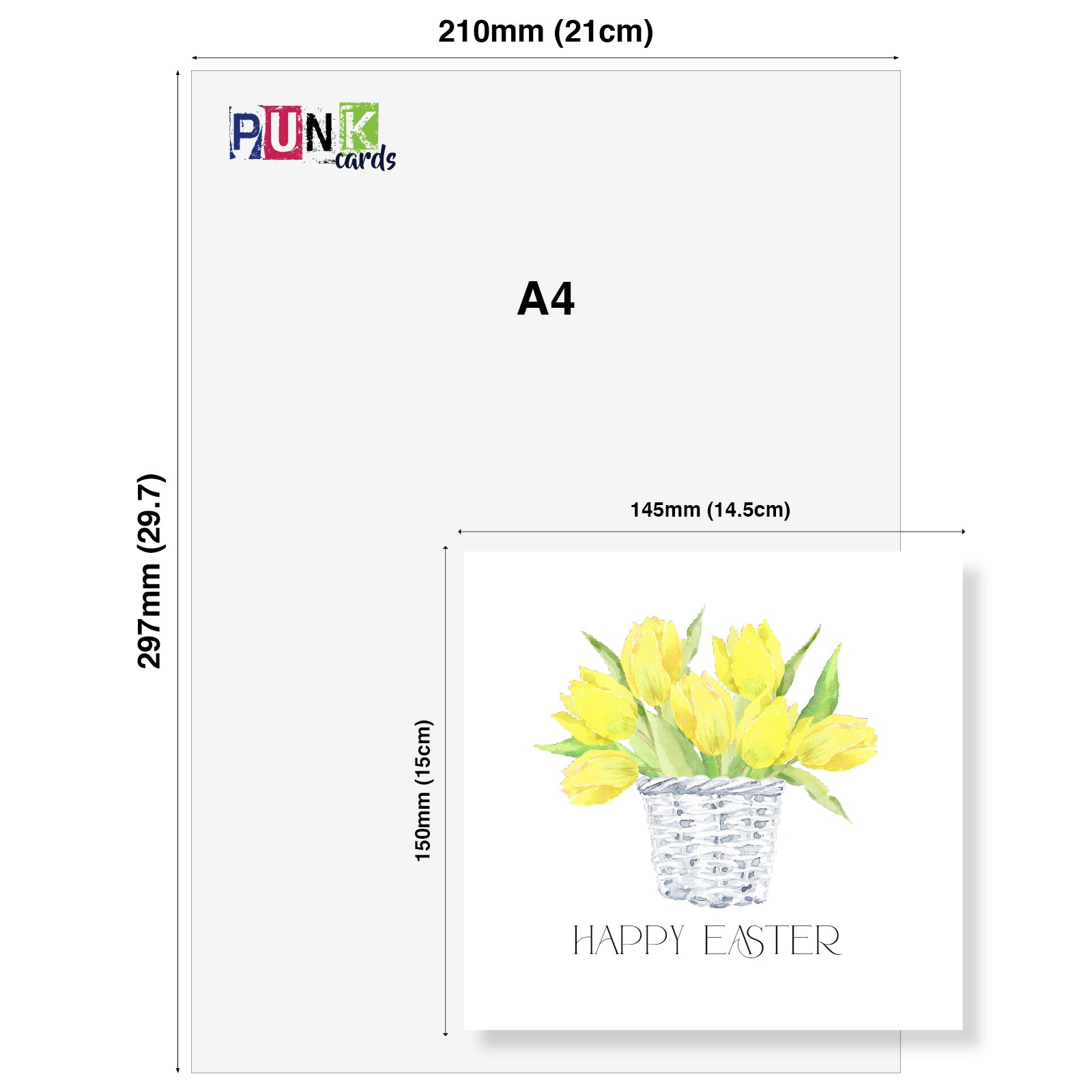 A classic Easter basket full of yellow tulips makes this card perfect for celebrating the season with warmth and colour.