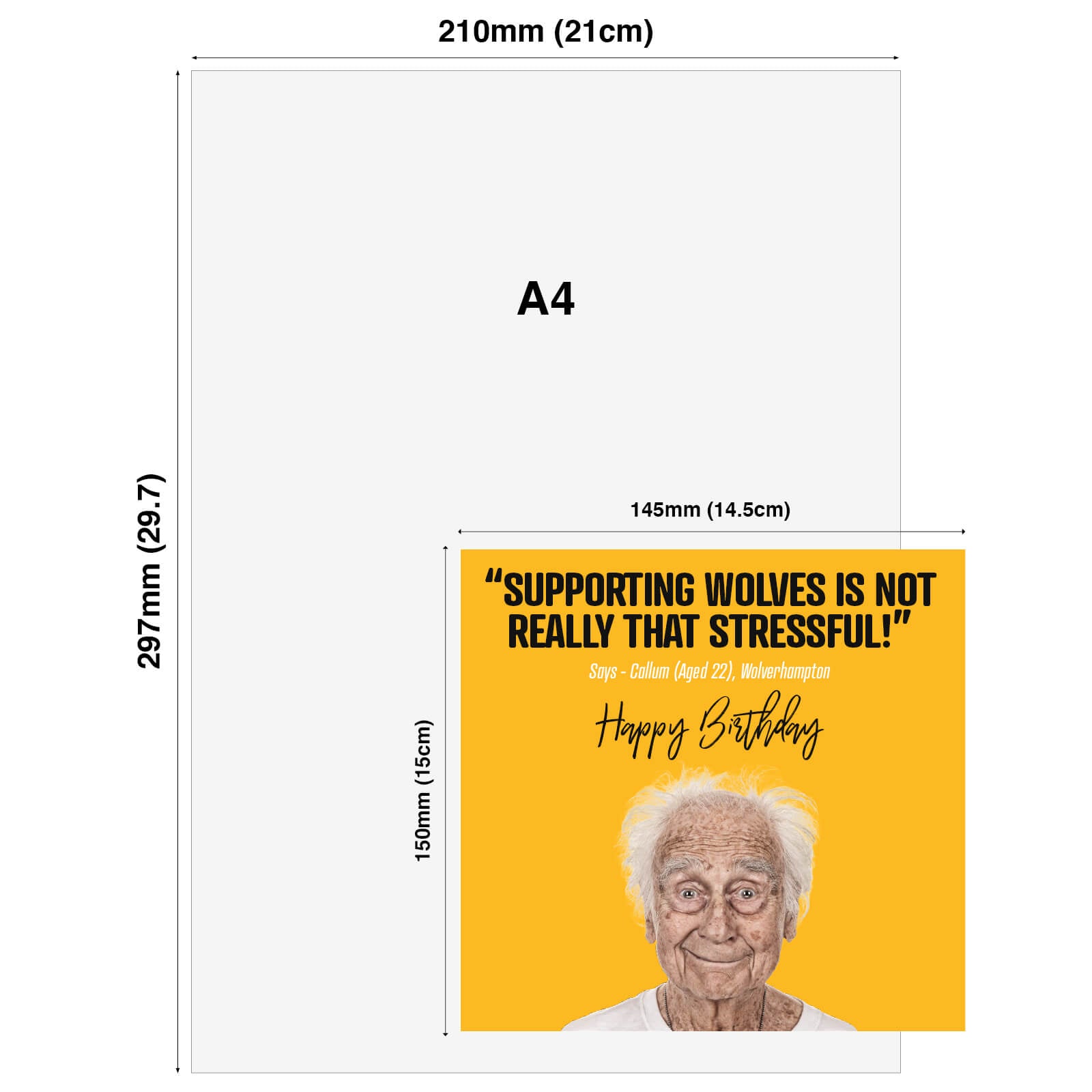 That aged face says it all. “Supporting Wolves is not really that stressful!” – claims Callum, aged 22, from Wolverhampton. A perfect card for fans with a sense of humour and a few more grey hairs.