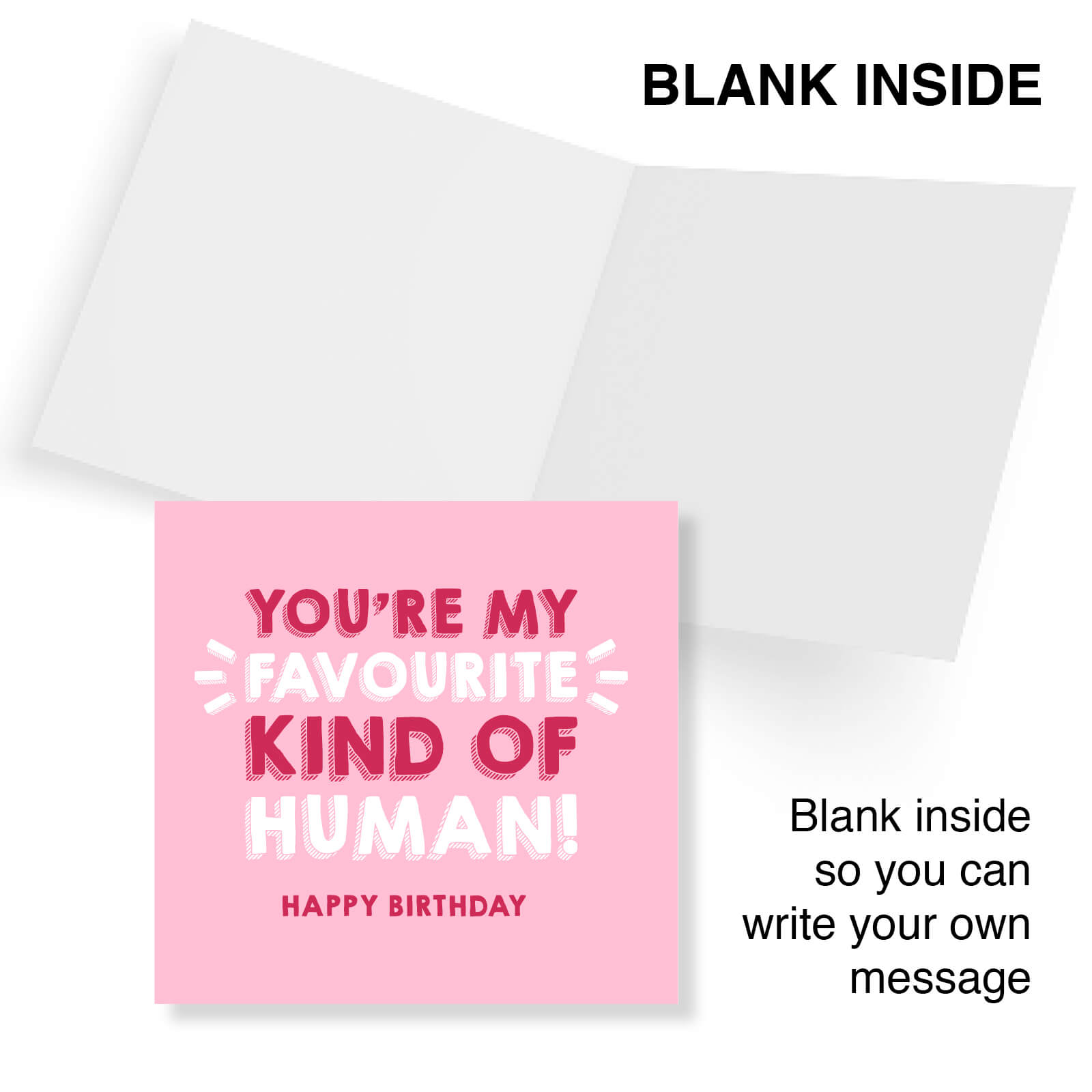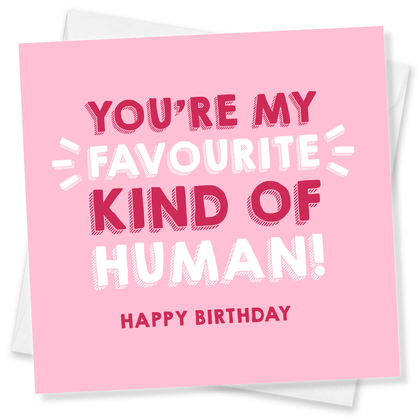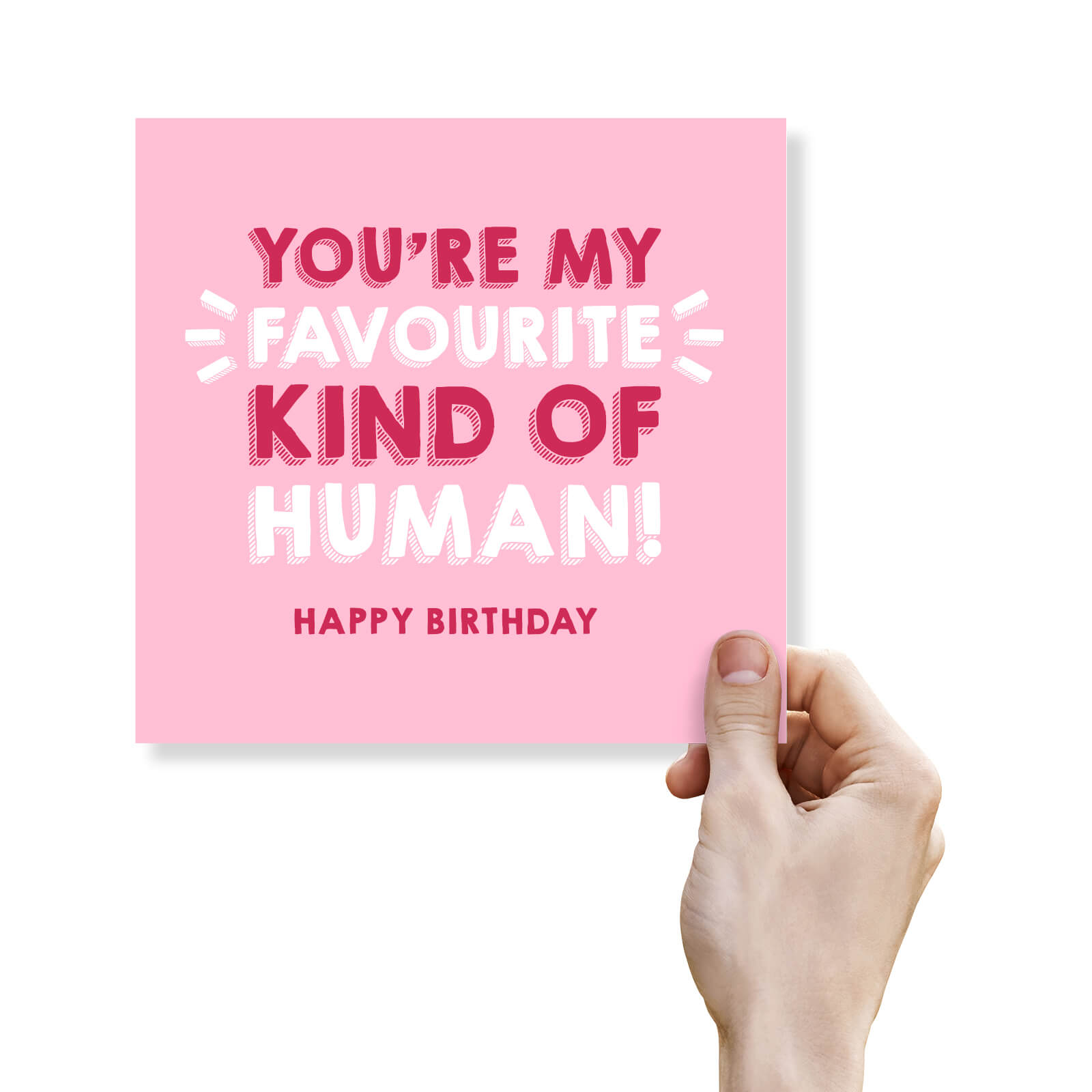 A sweet and quirky birthday card for your absolute fave human! With bold pink and white text on a soft pink background, this card is perfect for your bestie, partner, or anyone who deserves a bit of love on their special day. Cute, charming, and totally heartwarming.