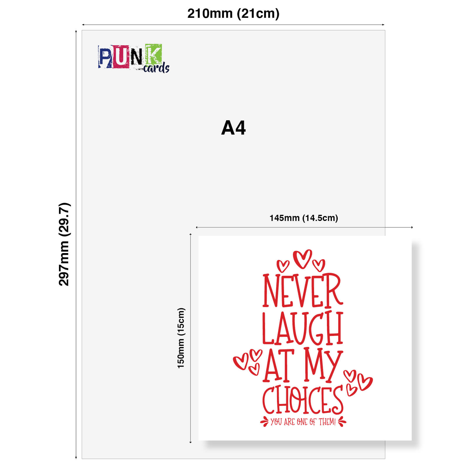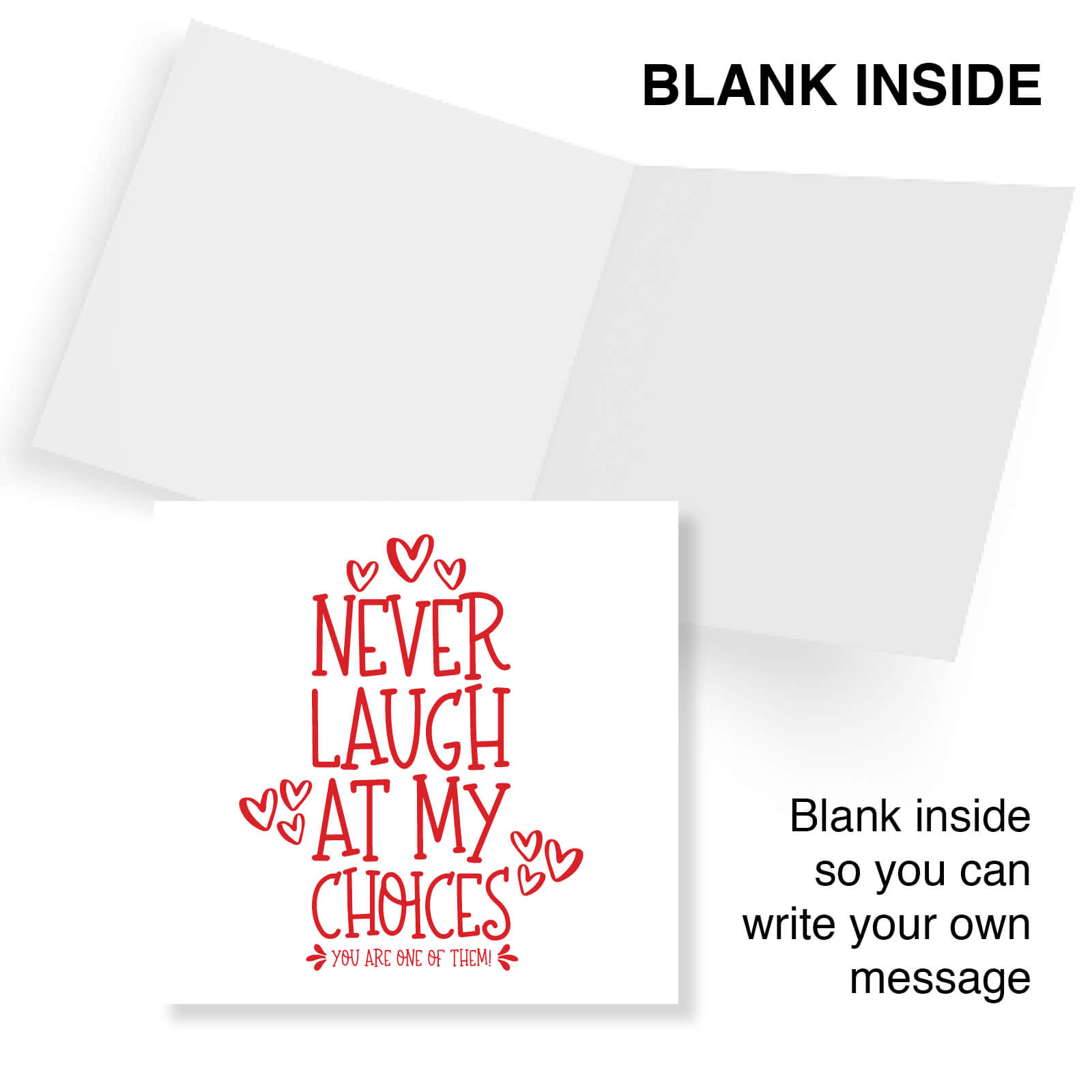 Cheeky and full of love, this birthday card is perfect for your partner or bestie with a great sense of humour. Featuring the hilarious line *“Never laugh at my choices... you are one of them!”*, it’s a witty way to show affection with a little side of sass.