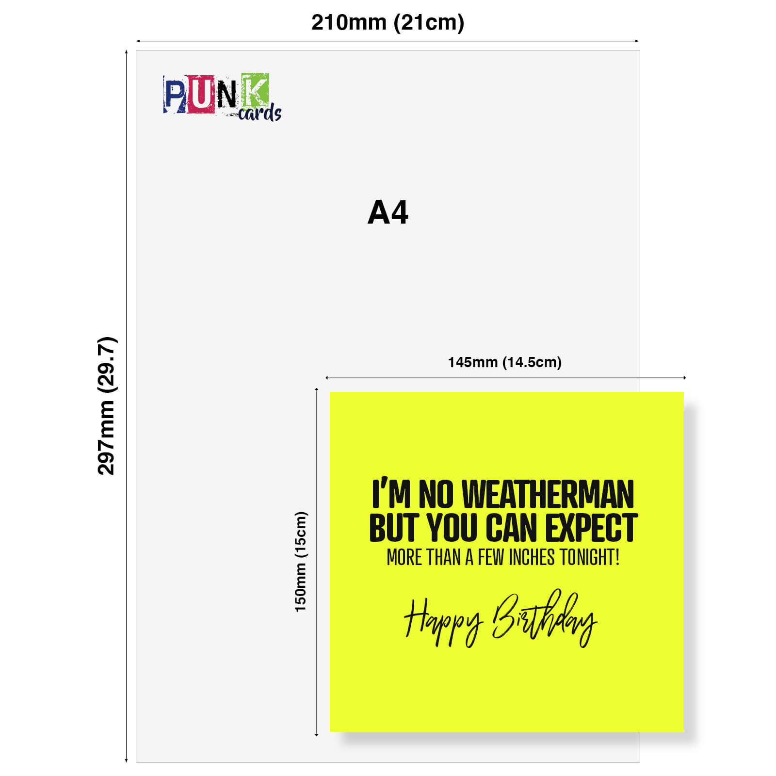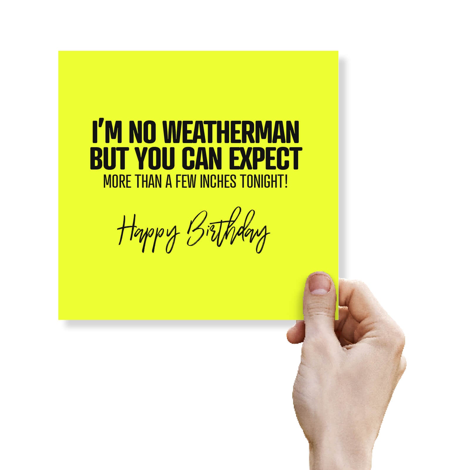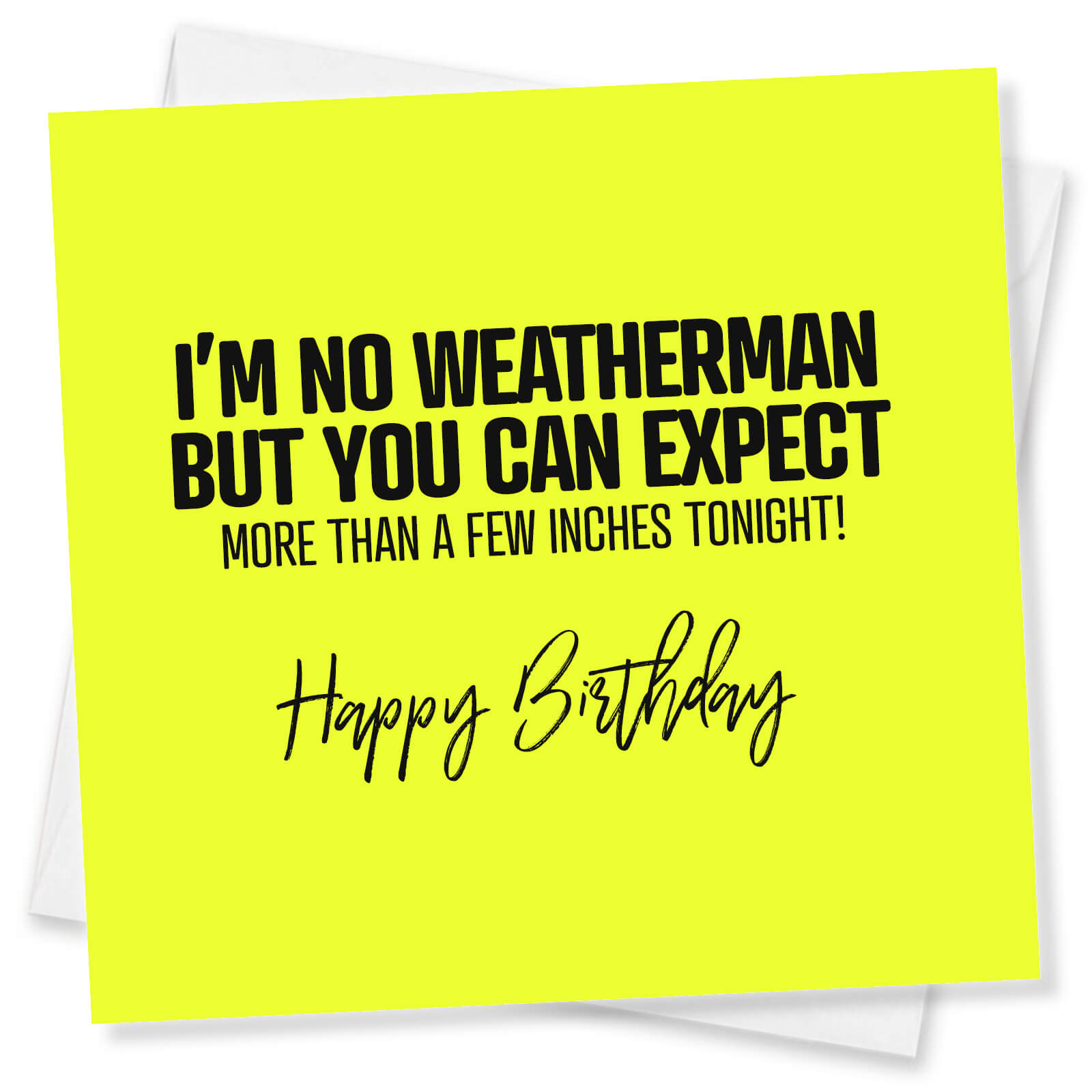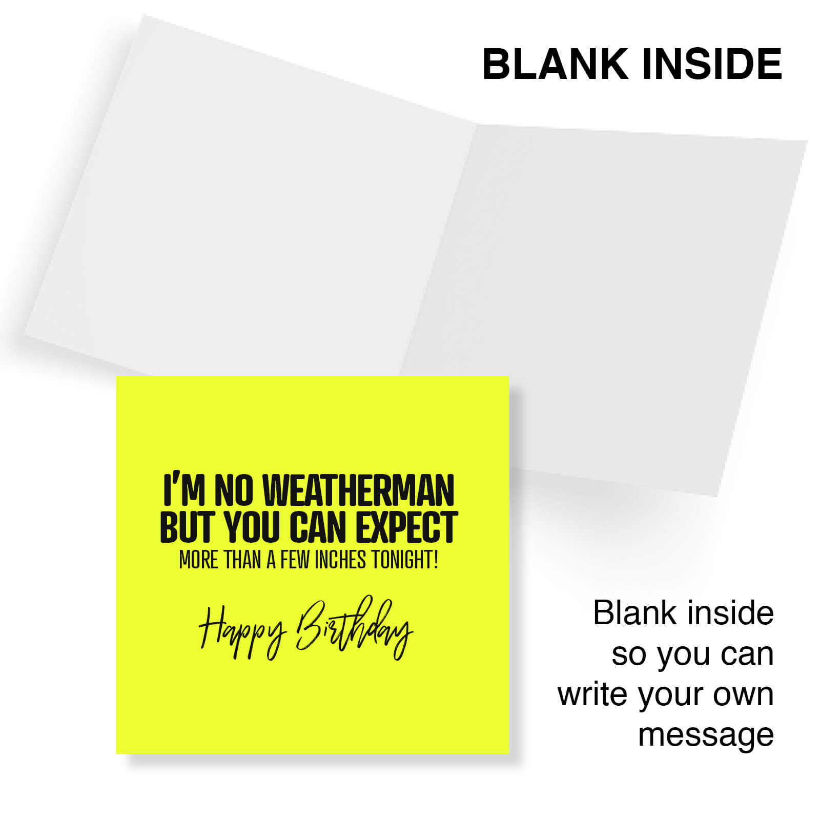Forecast a hilarious birthday surprise with this risqué card! Playfully suggestive and outrageously funny, it's perfect for the cheeky partner who enjoys adult humour. Warning: may result in blushing, laughter, and high expectations—just what a great birthday should be about!