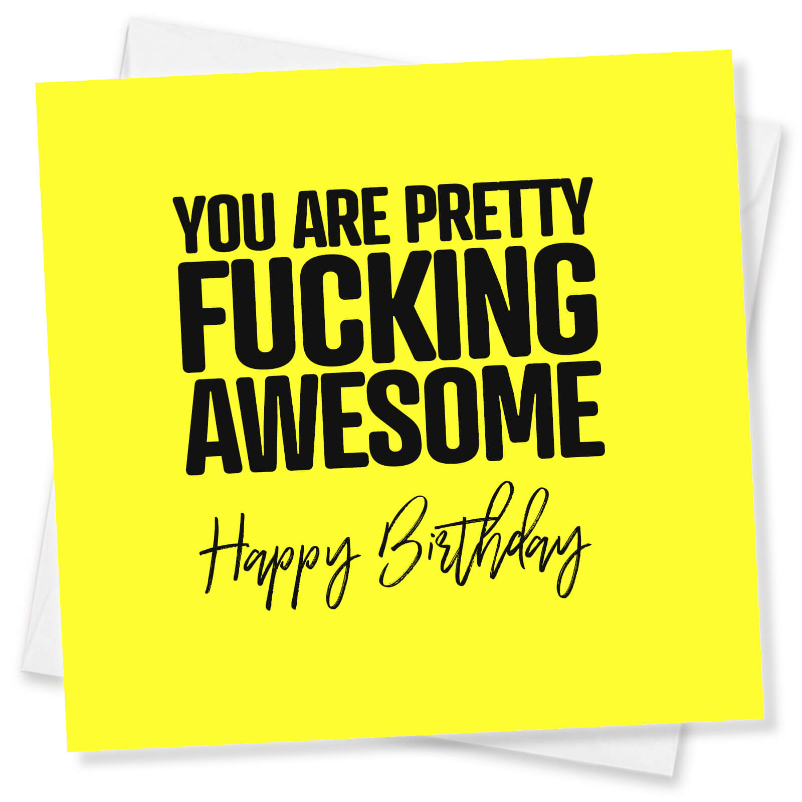 Pretty Fucking Awesome. This bold birthday card is perfect for that special person in your life who deserves an unfiltered compliment. Celebrate their awesomeness loudly and rudely with this brightly coloured card. Whether it's a friend, sibling, or partner, they'll appreciate the straight-to-the-point message that leaves no doubt about how awesome they truly are!