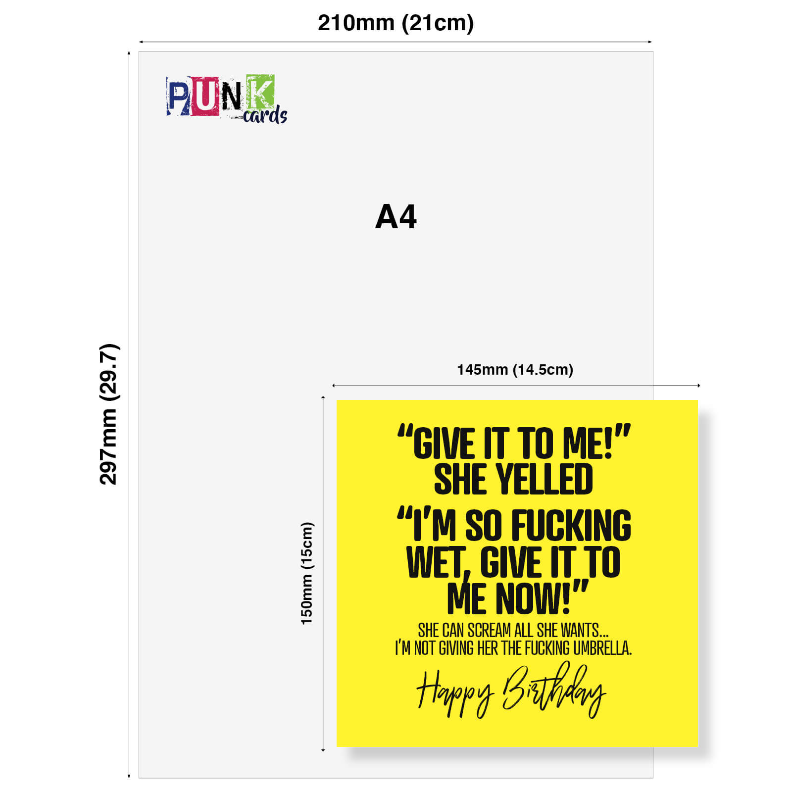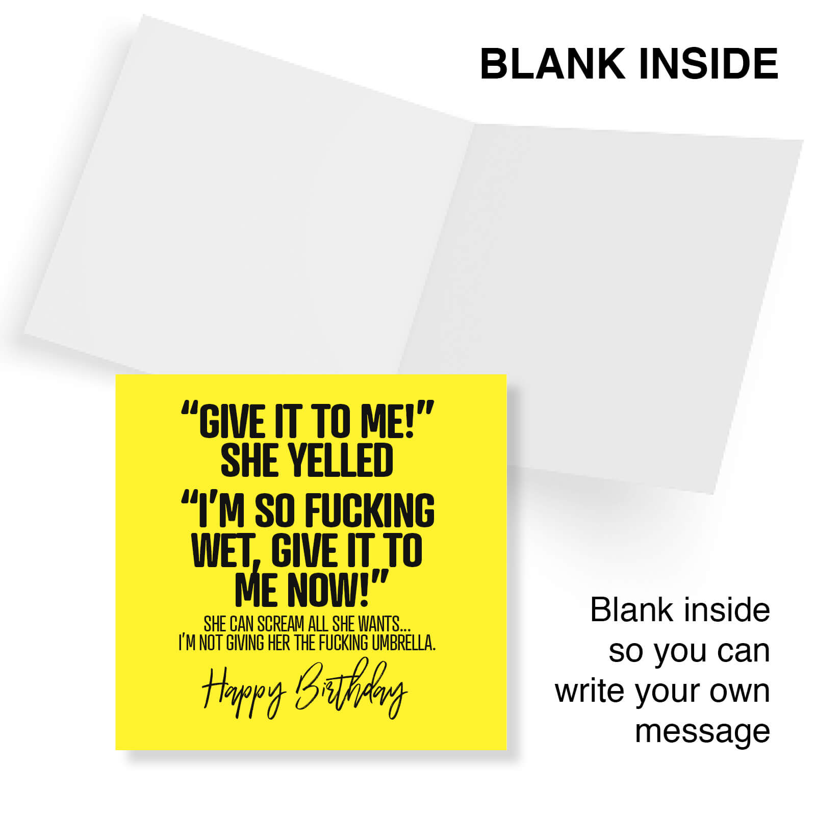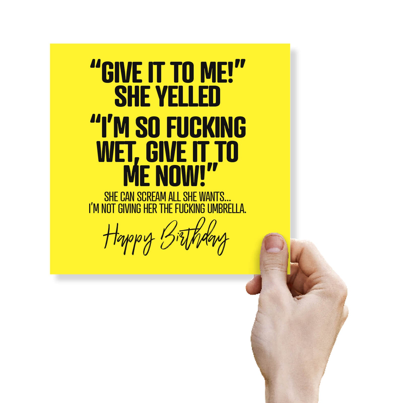 Umbrella Card. A raunchy yet cleverly deceptive birthday card, perfect for that friend with a wicked sense of humour. Initially shocking, it cleverly reveals the innocent reality of a rain-soaked situation. Great for someone who appreciates jokes with a naughty twist and double entendre. Expect loud laughter and blushing cheeks when they open this one!