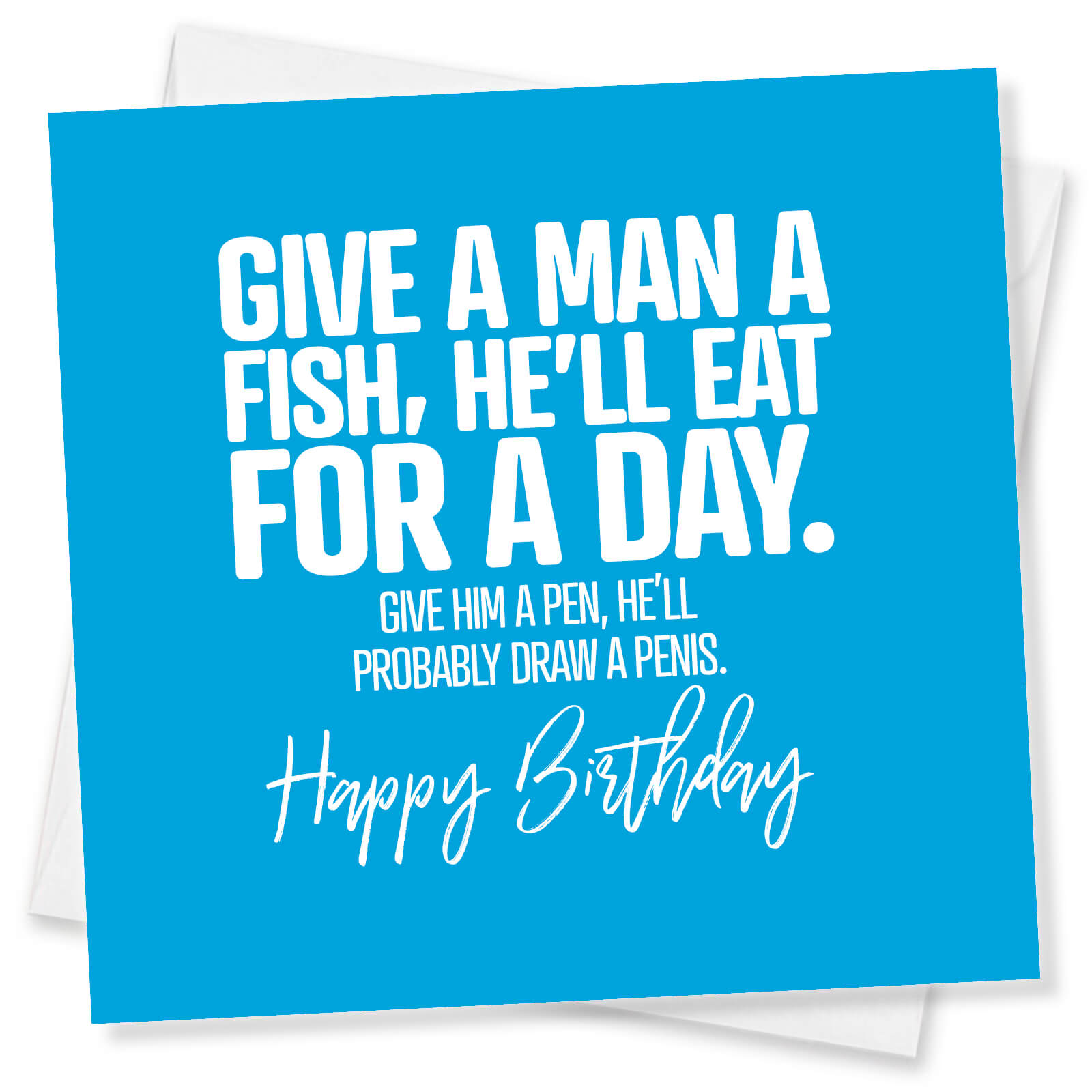 Give a Man a Fish" Card. Offering timeless wisdom with a hilariously rude twist, this birthday card is perfect for anyone with a playful, juvenile sense of humour. Bright, bold, and slightly offensive, it’s the ideal greeting for that friend who still giggles at penis doodles. Give this card to a loved one who values laughs over sentimentality.