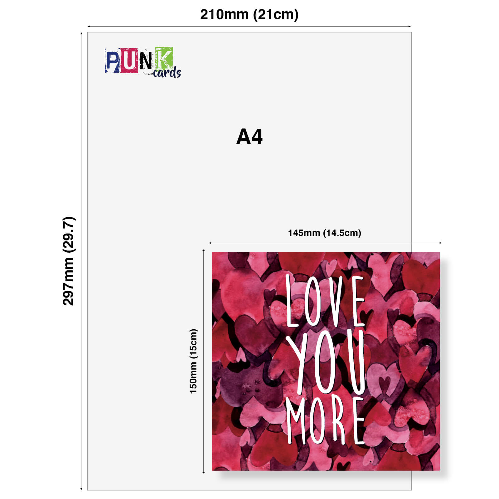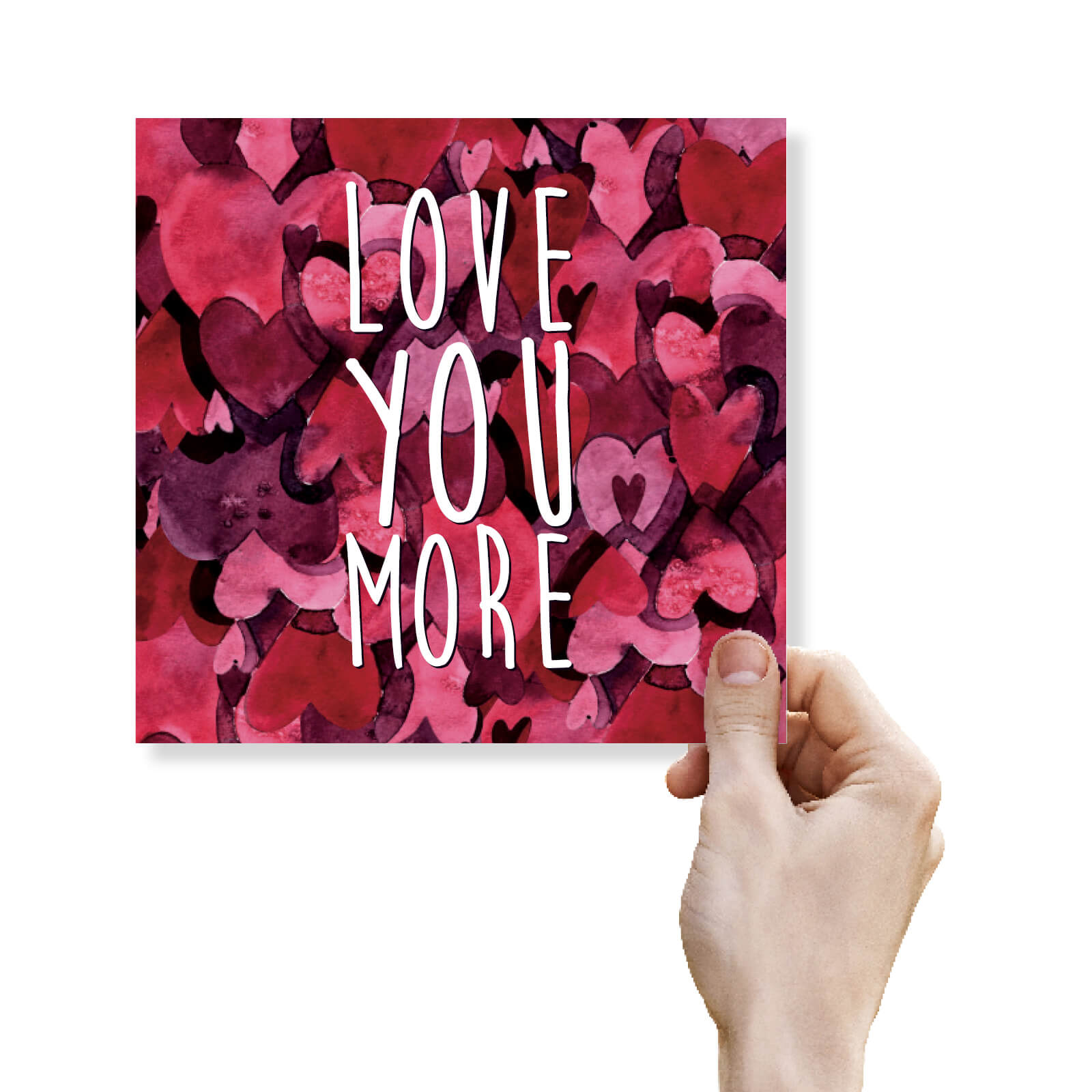Let the background do the talking while you steal their heart (again). A bold declaration of love on a rich, romantic pattern of hand-painted hearts. Perfect for: Passionate love, competitive lovers (“I love you more!”), or just because.