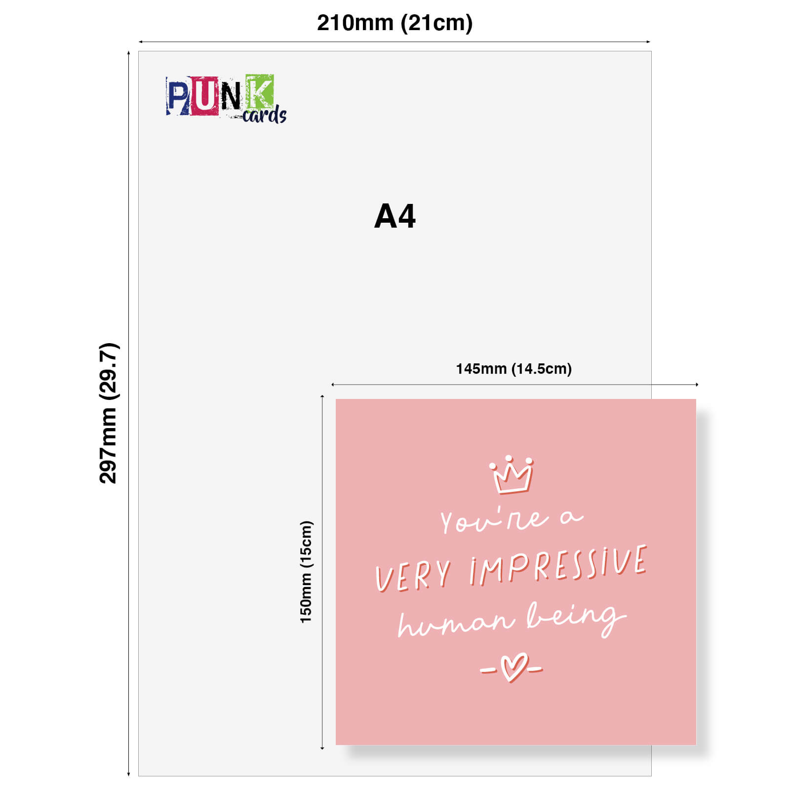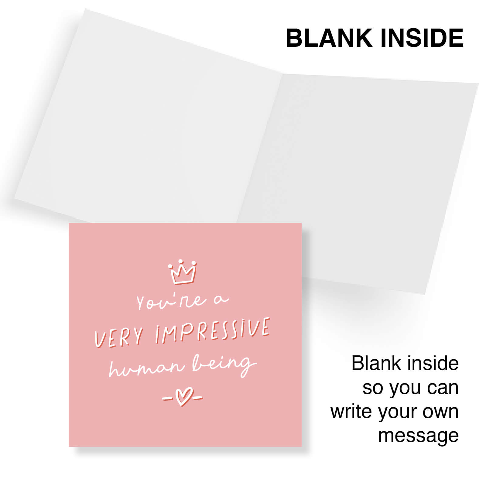 You're a Very Impressive Human Being Card - Let them know how amazing they are with this charming "You're a Very Impressive Human Being” card. With a cute crown and heart design on a soft pink background, it's perfect for recognising achievements and boosting confidence. Ideal for promotions, graduations, or just because! Blank inside for your personal touch.